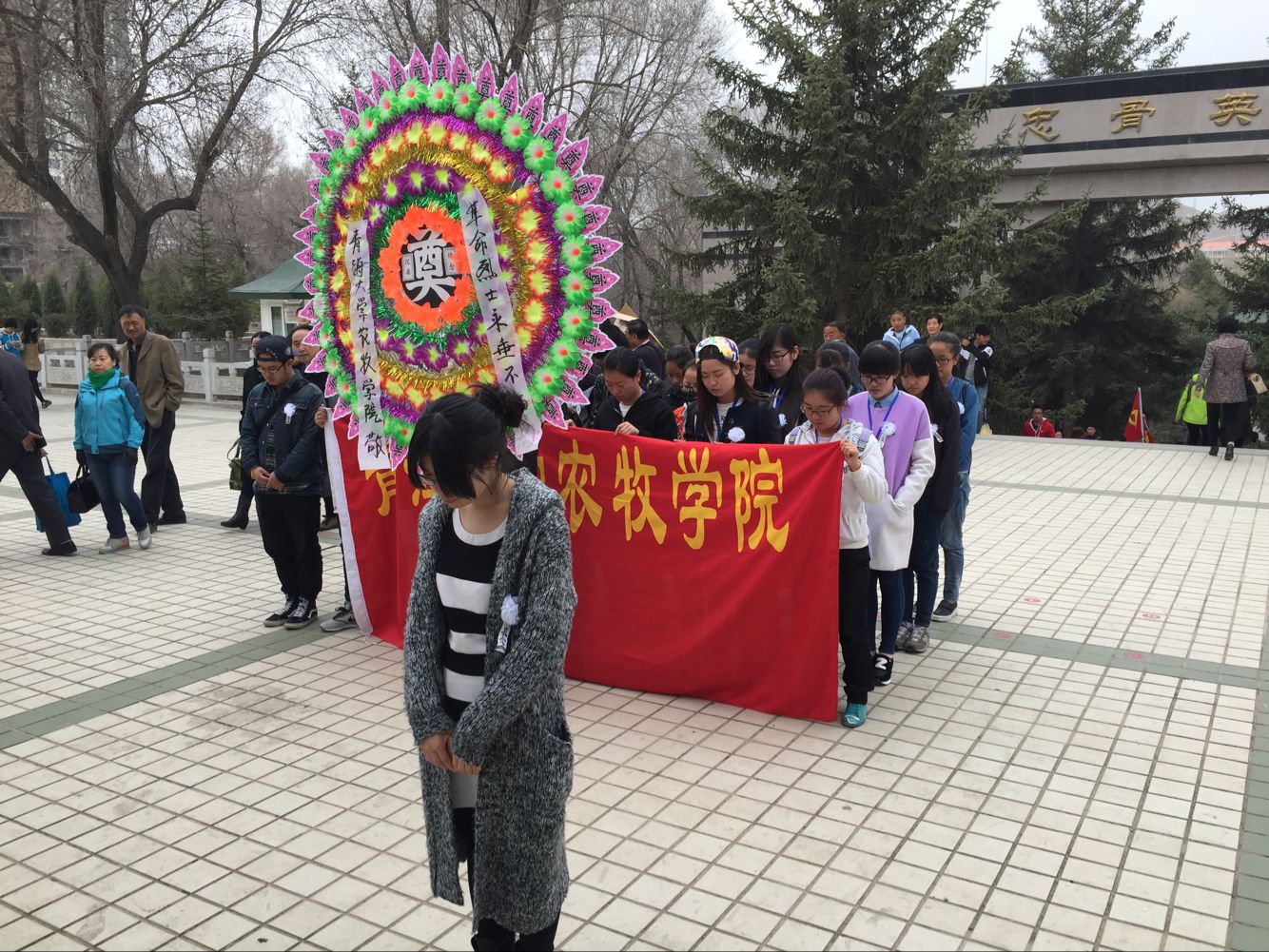 同学们首先向烈士纪念碑敬献了花圈。站在庄严肃穆的烈士纪念碑前,大家表达着深切的哀悼。学生代表发言并宣誓,要继承革命先烈的遗志,珍惜现在来之不易的幸福生活,努力学习,勤奋工作,帮助他人,服务社会,传播先进文化,践行社会主义核心价值观,为实现国家富强、民族复兴、人民生活的更加安宁幸福而贡献自己的力量,以此实际行动来告慰英魂。
