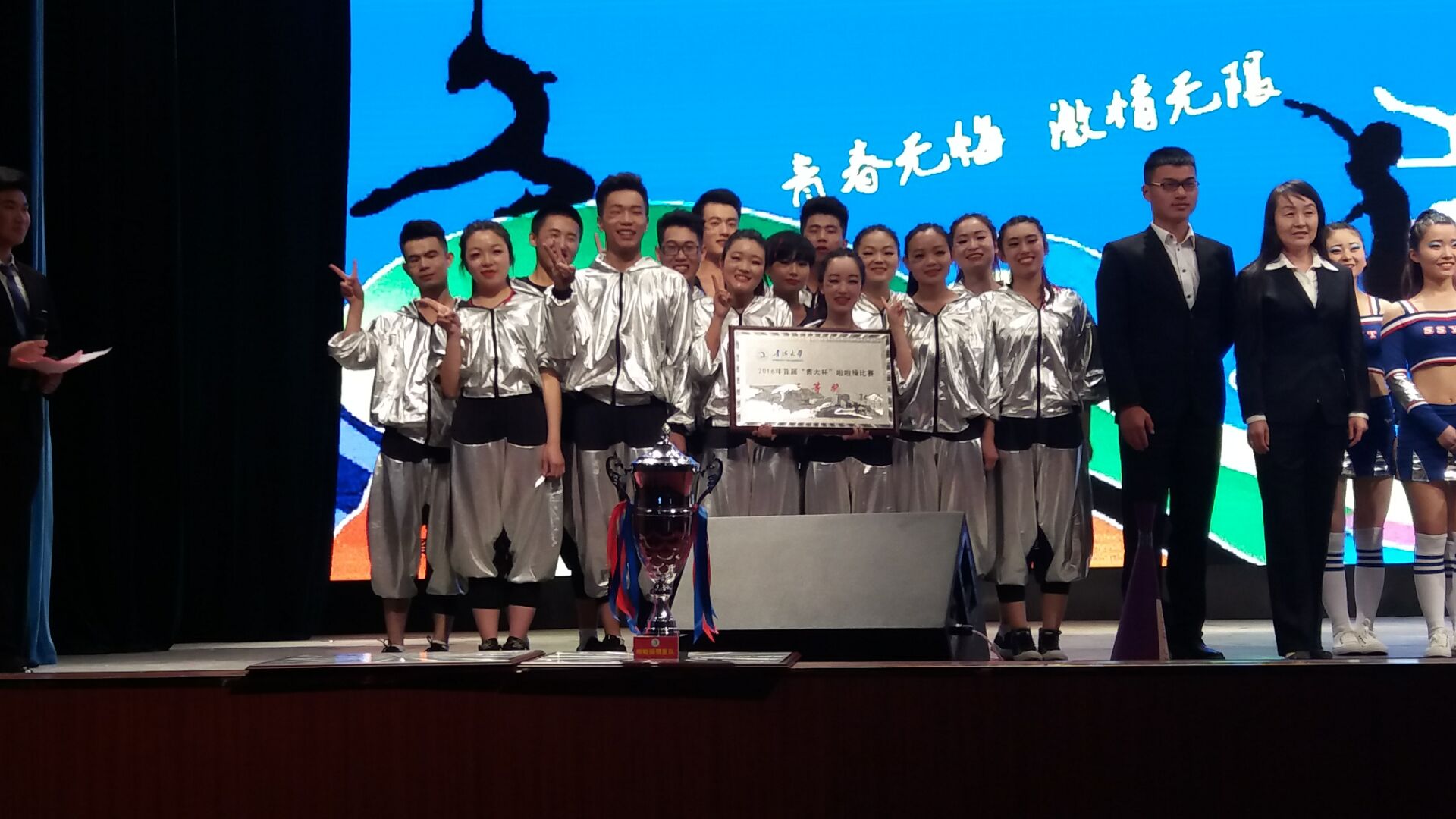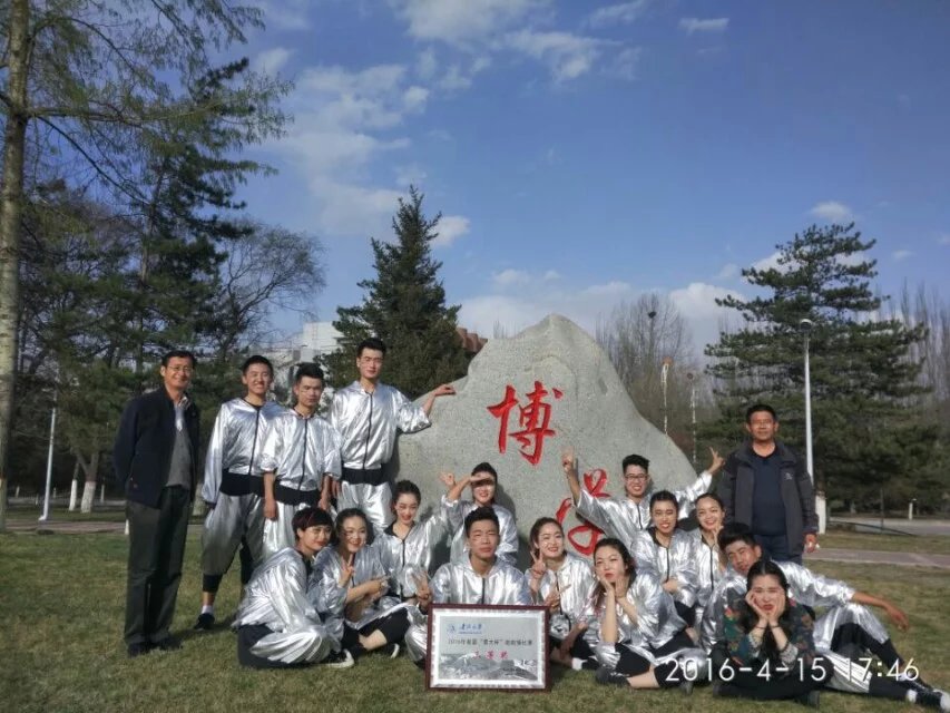 为响应学校阳光体育运动,提高学生的综合素质,体现当代大学生“青春无悔、激情无限”的健康、阳光、积极向上的精神面貌,由海棠书屋 学生管理部(团委)组织,学生自行编排的14人啦啦操队,在4月15日的“青大杯”啦啦操比赛中,获得了三等奖的好成绩。