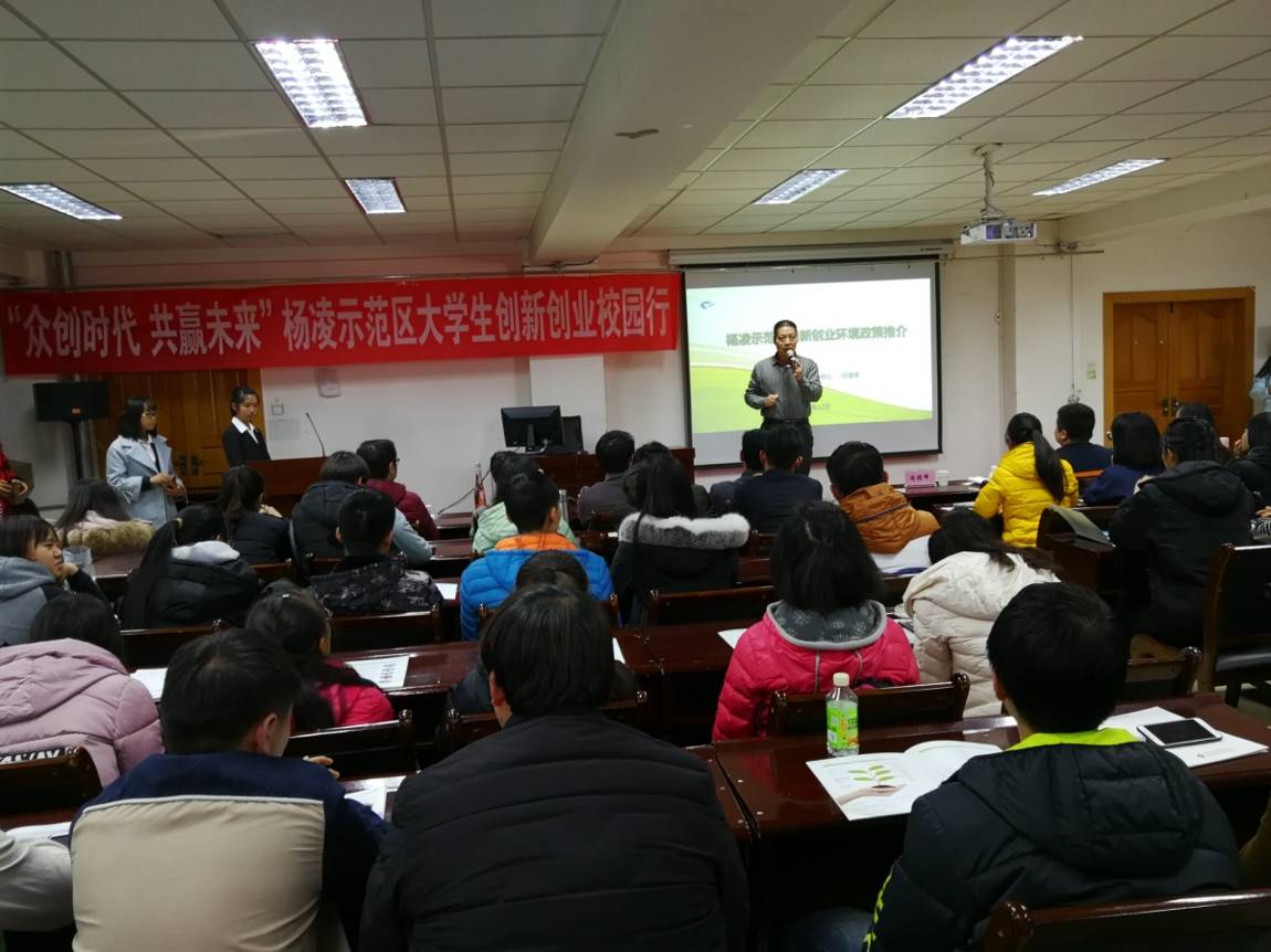 12月1日下午,由海棠书屋 和陕西杨凌示范区创业服务中心共同举办的“‘众创时代,共赢未来’杨凌示范区大学生创新创业校园行”活动在海棠书屋 楼619会议室举行。杨凌示范区创业服务中心副主任同德峰、创业促进部部长胡琳琳,创业导师、青海众创空间创业孵化服务公司行政总经理、城北区大学生创业孵化基地办公室主任田海,大学生创业企业代表-陕西大能猫食品科技有限公司总经理康凯,杨凌示范区大学生创业基地办公室王星等应邀来院,海棠书屋 党委书记王永杰、院学生管理部副主任俞文明和吴海庆以及140余名学生参加了本次活动。院学生会干部司思同学主持了活动。
